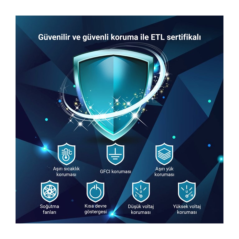 Світлодіодні індикатори захисту від низької  та перенапруги, захисту від перегріву, захисту від перевантаження та індикації короткого замикання. Вентилятори охолодження та захист від замикання на землю (GFCI).